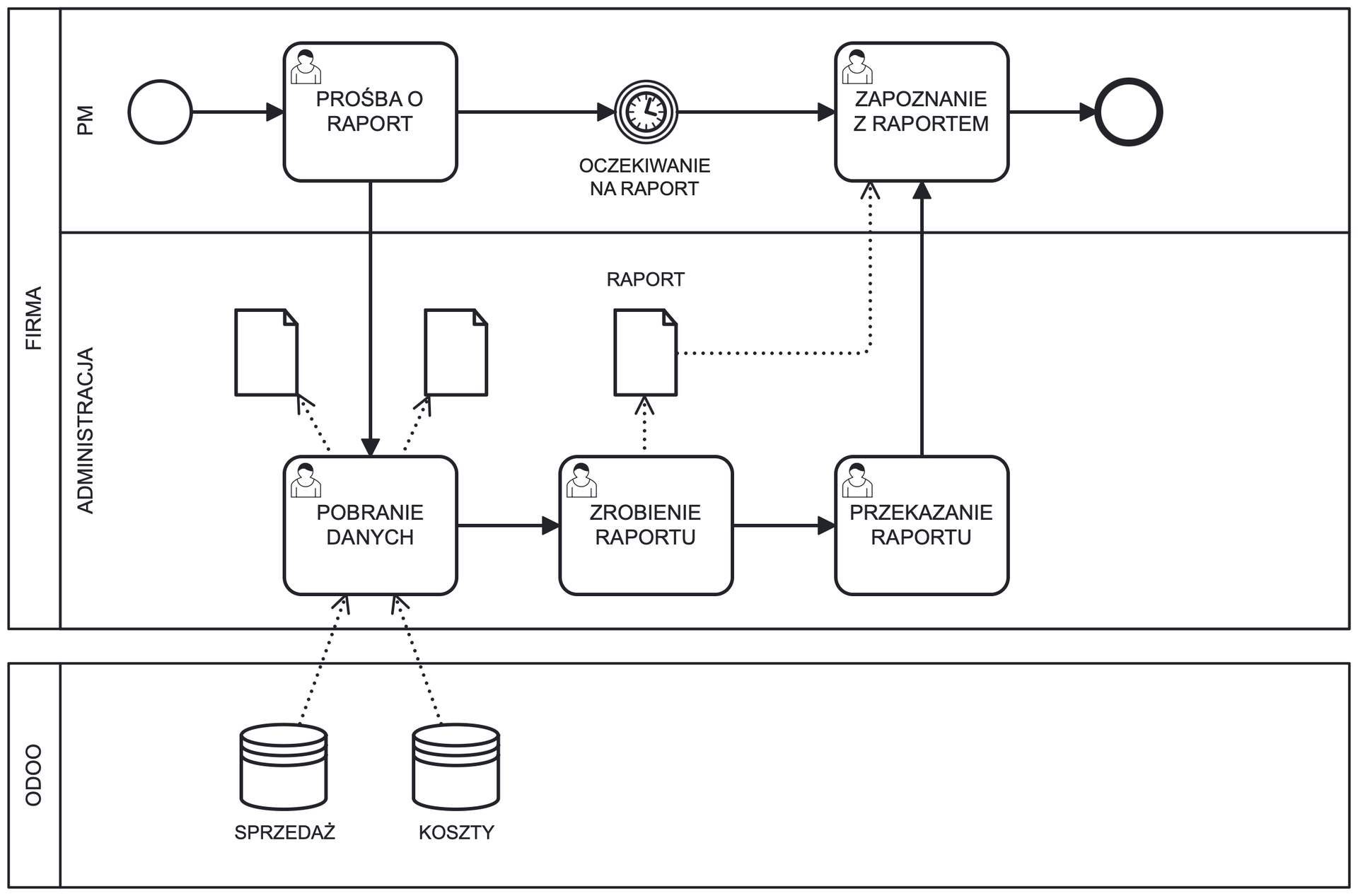 Podczas jednego z wdrożeń systemu Odoo u klienta z branży projektowo - usługowej, ujawniono istotną potrzebę raportową. Klient regularnie przygotowywał raport podsumowujący dane sprzedażowe i kosztowe w realizowanych projektach, które były wykorzystywane przez kadrę zarządzającą do analiz miesięcznych i rocznych. Raport ten był tworzony ręcznie w pliku XLSX na podstawie danych eksportowanych z Odoo.