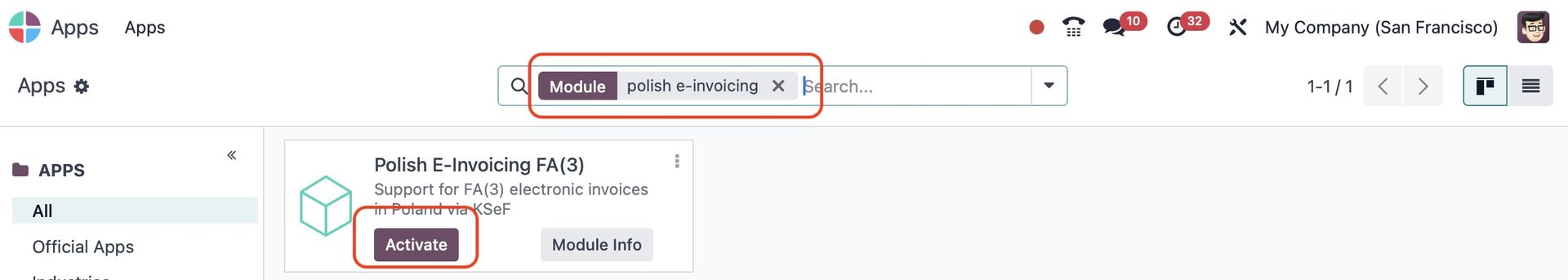 Po uruchomieniu instancji upewnij się, że moduł Polish E-Invoicing FA(3) jest zainstalowany.