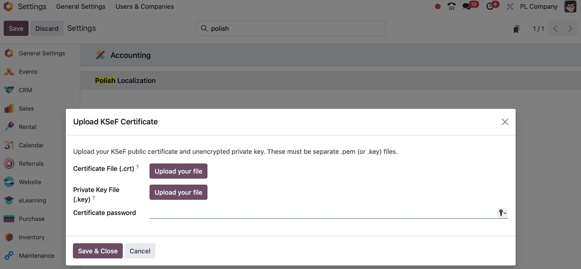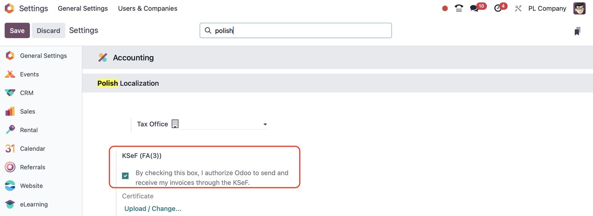 Aby przetestować integrację KSeF, upewnij się, że Twoja firma w Odoo jest ustawiona jako PL Company.