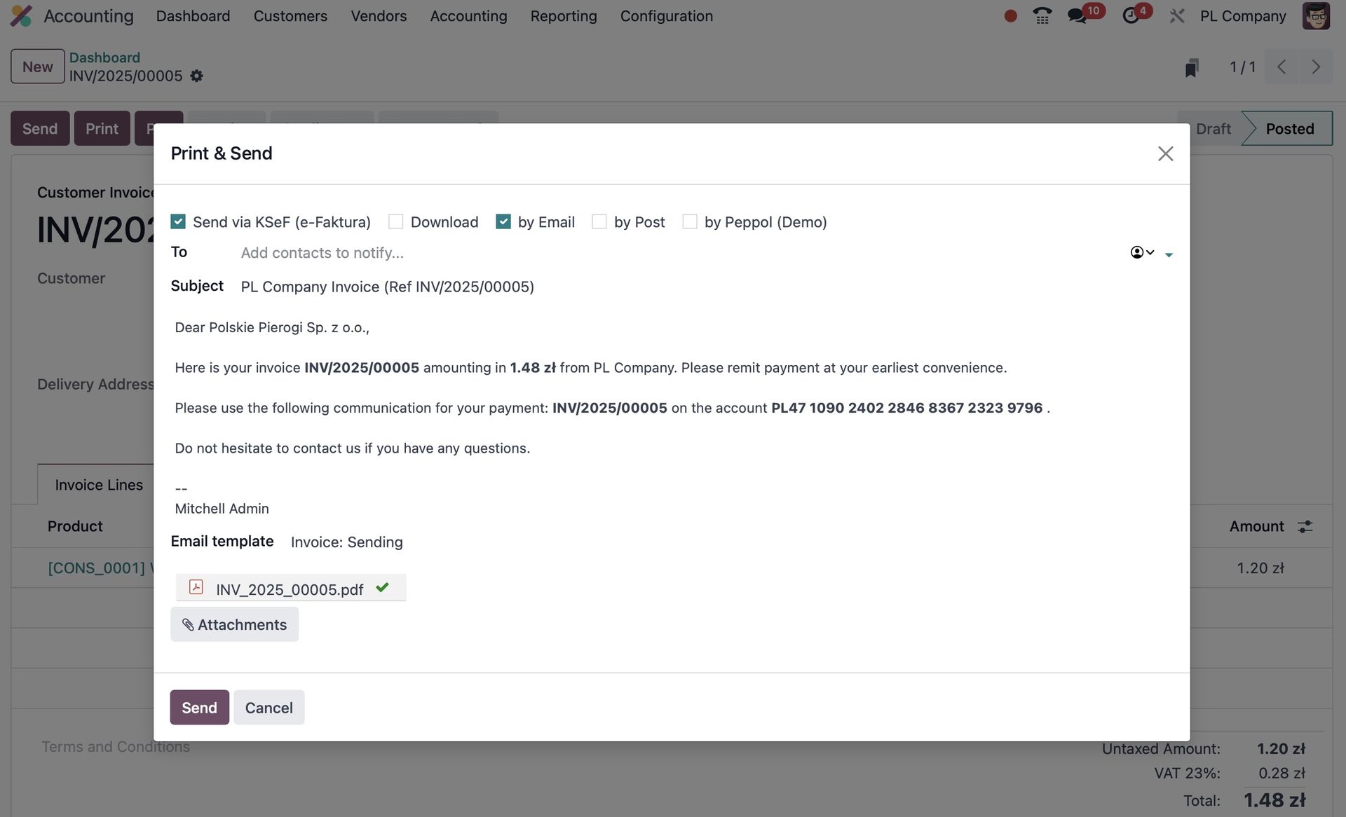 Jeśli konfiguracja została wykonana prawidłowo, Odoo uzyska token autoryzacyjny. Od tego momentu możesz bez przeszkód wysyłać faktury.