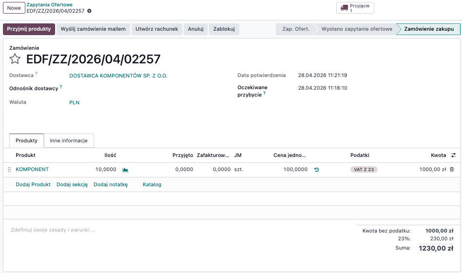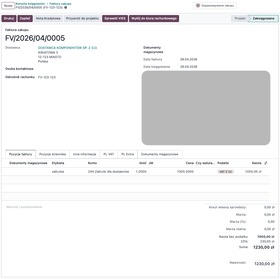 Przykładowo załóżmy, że zostało wystawione zamówienie zakupu na kwotę 100 zł netto.