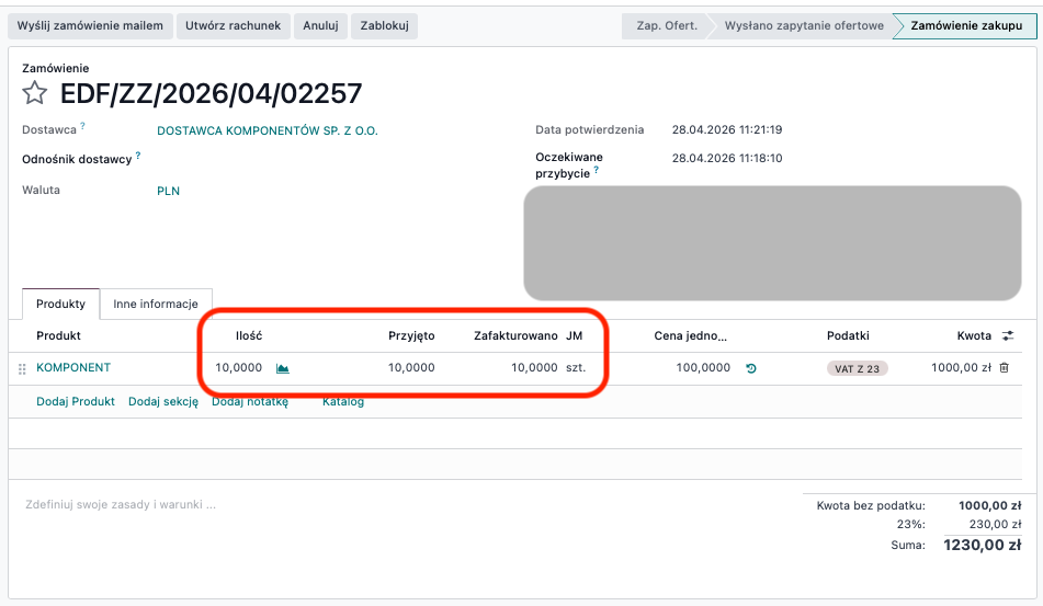 Po zaksięgowaniu powyższej faktury końcowej zamówienie zakupu zostanie w pełni rozliczone i uznane za całkowicie zafakturowane. Przykład: