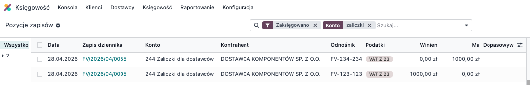 Otrzymaliśmy od dostawcy fakturę zaliczkową obejmującą 100% wartości zamówienia. Dokument ten wprowadza się do systemu analogicznie jak standardową fakturę zakupu (Księgowość → Faktury zakupu) - lub innego dziennika który jest do tego przygotowany w Twojej parametryzacji systemu. Podczas dekretacji należy wskazać właściwe konto przeznaczone do ewidencji zaliczek, dodać opis oraz wprowadzić kwotę zaliczki. Po zaksięgowaniu faktury można ją rozliczyć, przypisując do odpowiedniej płatności wynikającej z wyciągu bankowego.