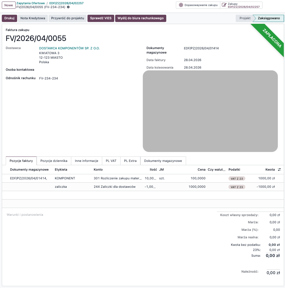Jeśli zaliczka obejmowała 100% wartości zamówienia, kwota do zapłaty wynikająca z faktury końcowej wyniesie 0 zł. Dokument rozliczeniowy można wygenerować, wybierając opcję „utwórz rachunek” z poziomu zamówienia zakupu. Wówczas dane oraz pozycje faktury zostaną automatycznie uzupełnione na podstawie informacji z zamówienia.